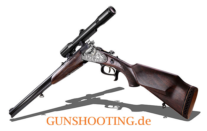 Schaft: Nussbaumkernholz mit Deutscher Backe und Hornabzugsbügel mit Fingerhaken